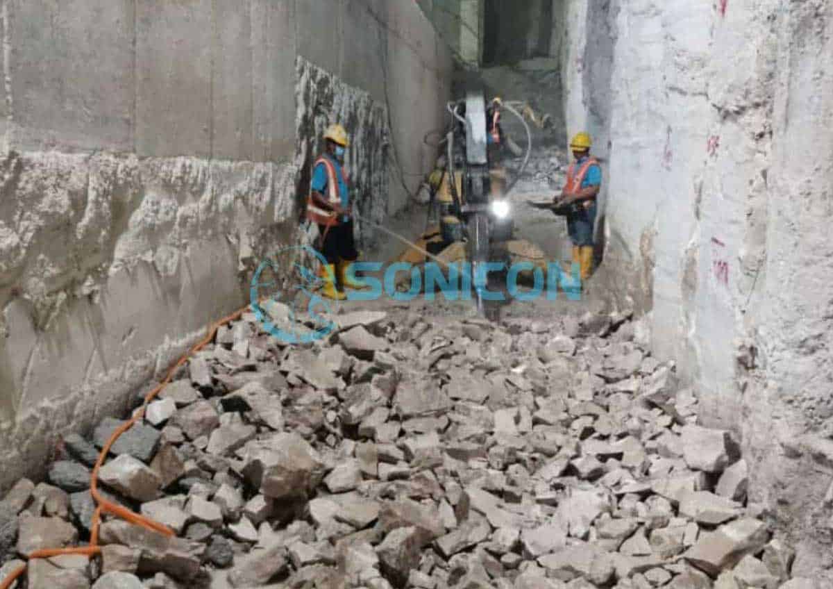 Sonicon Demolition Robot has been deployed to demolish internal structures such as Tower Crane base, Diaphragm Wall, Slabs and others where only human can access. Even with floor level height of 9 feet / 2.7m, we have demolished Tower Crane base within 7 days.